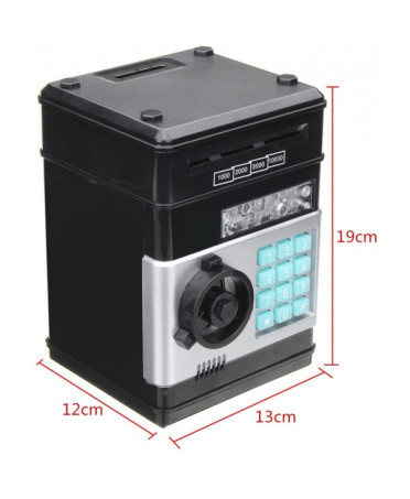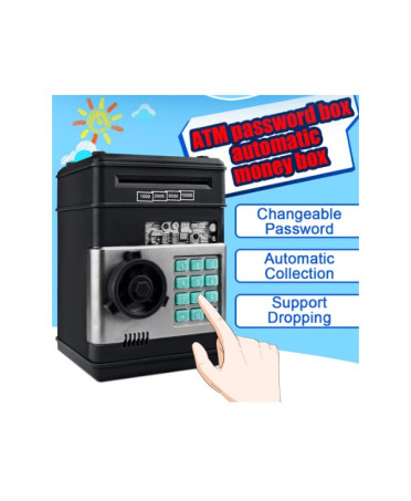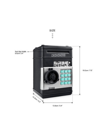 Type: boîte à mot de passe ATM tirelire automatique Quantité: 1 pièce Matériau: ABS + composants électroniques Couleur: argent/doré/bleu/rose/noir Batterie: 3 piles AA (non incluses) Taille: 13*12.5*19.5cm/5.1*4.9*7.7 ” (L * L * H)